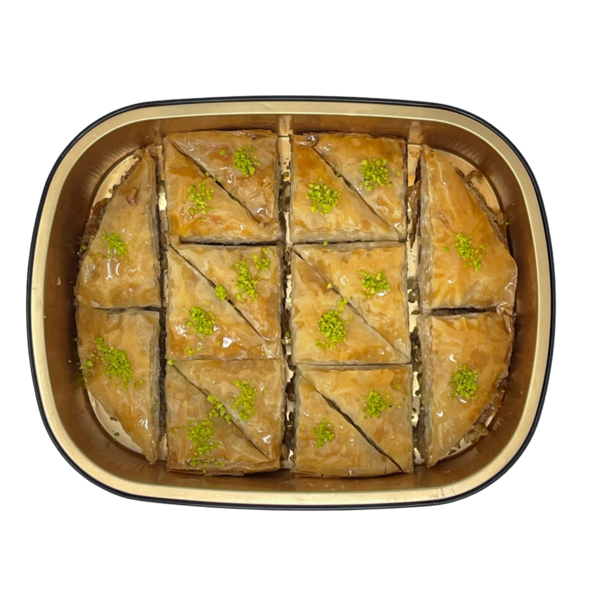 Indulge in our premium Persian baklava (باقلوا), crafted with delicate layers of flaky pastry and filled with finely ground pistachios.
